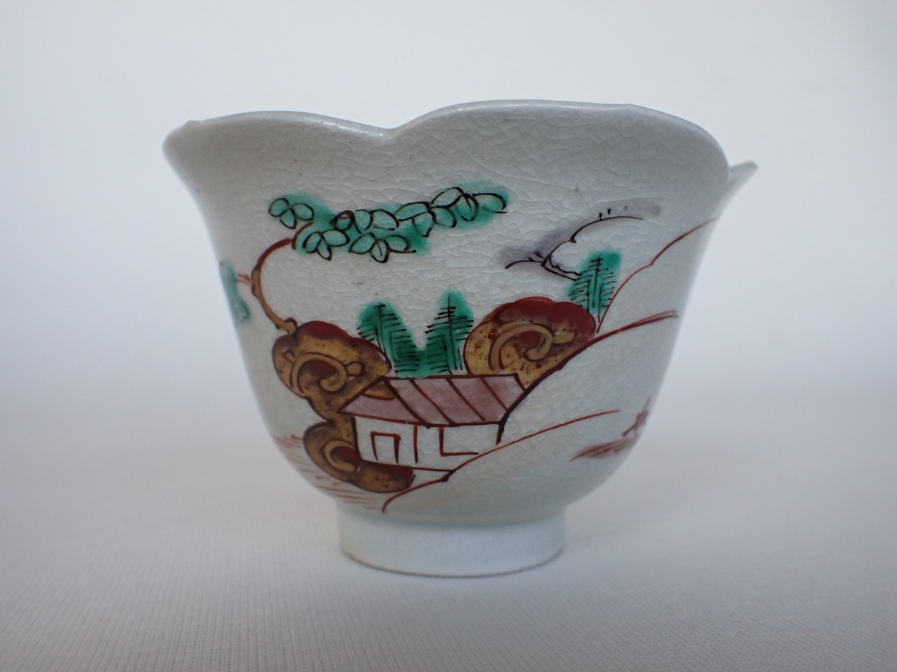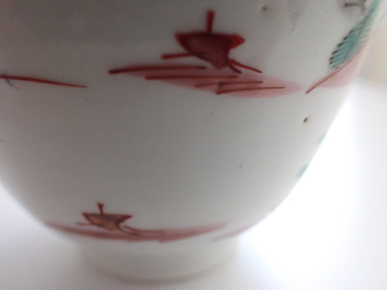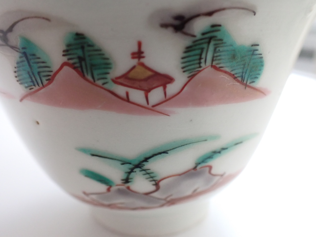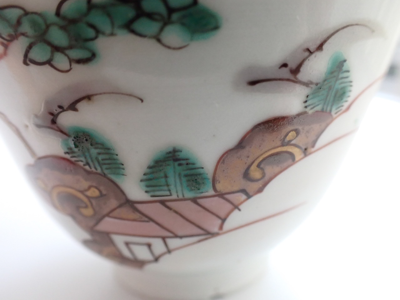 Imari cup from the mid-Edo period, decorated with a landscape, consisting of a house, a pagoda, trees and other elements.