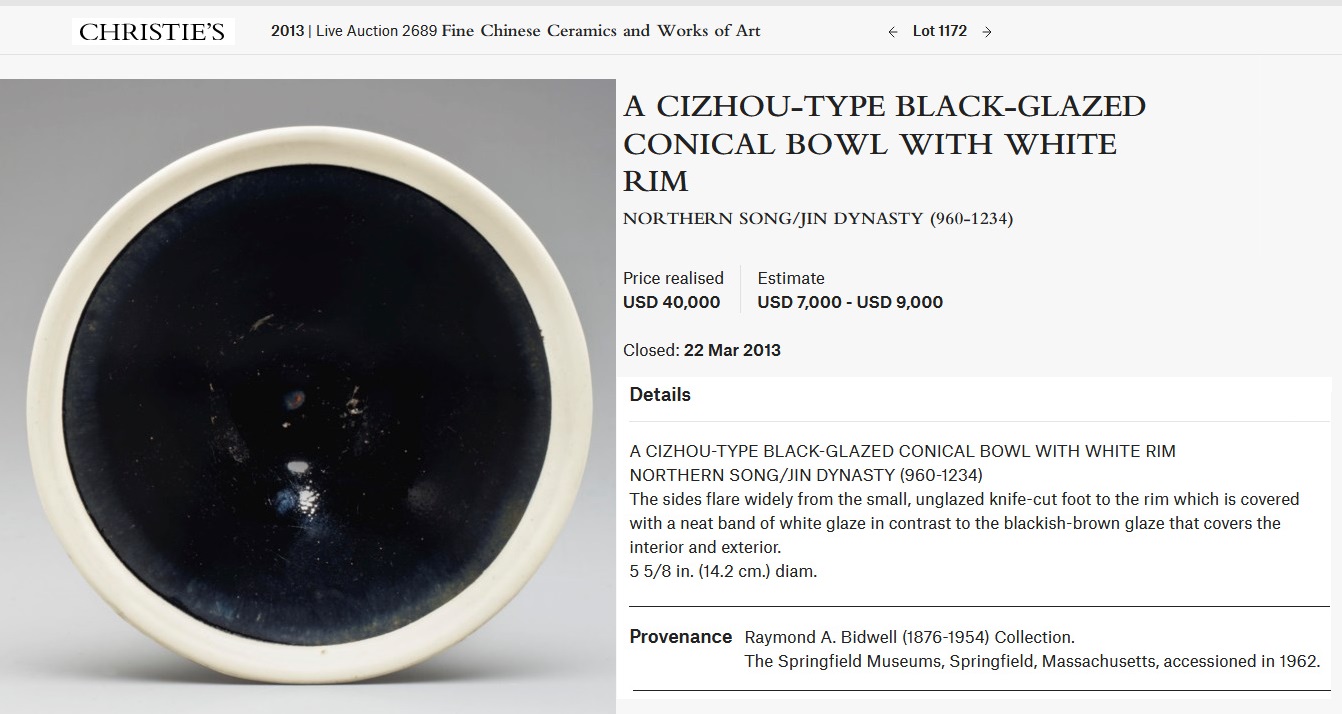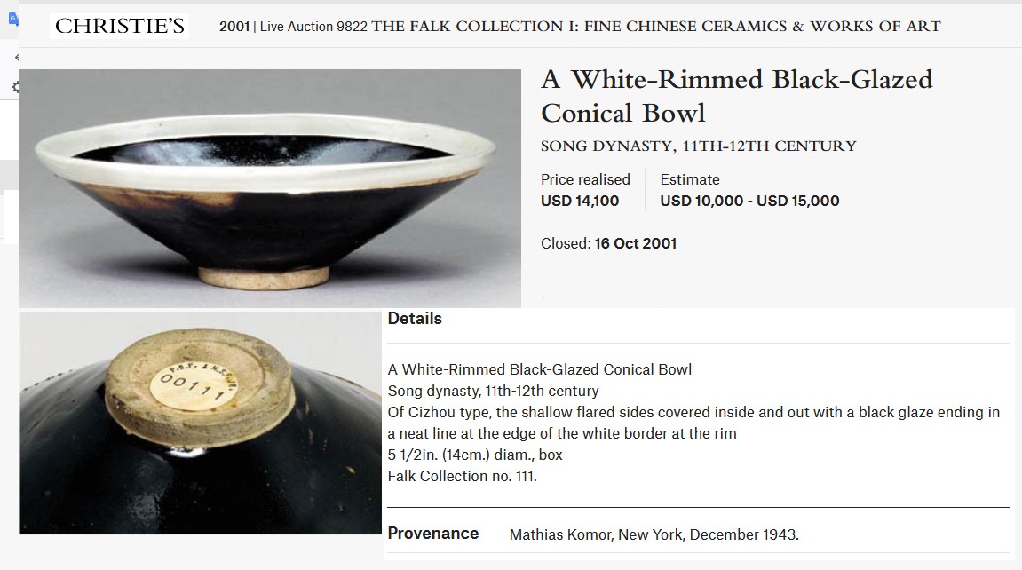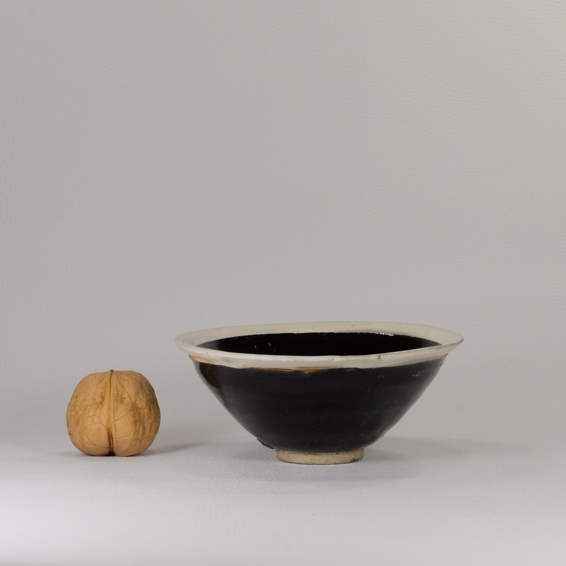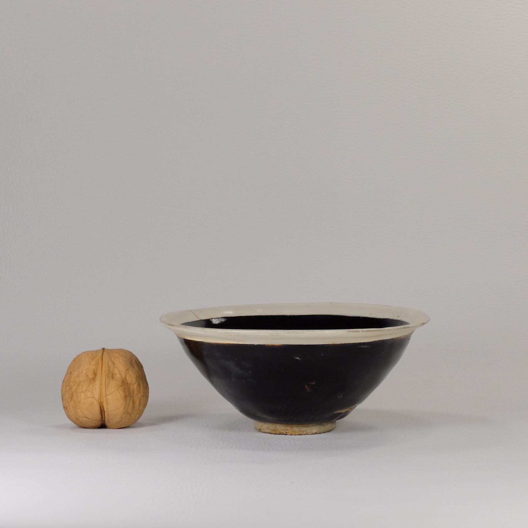 Description: Chinese Northern Song black bowl of Cizhou type with contrasting white rim and of conical shape. In Chinese they are called Bai Fu Lun (White covered rim). There is an ink written Chinese character on the base.