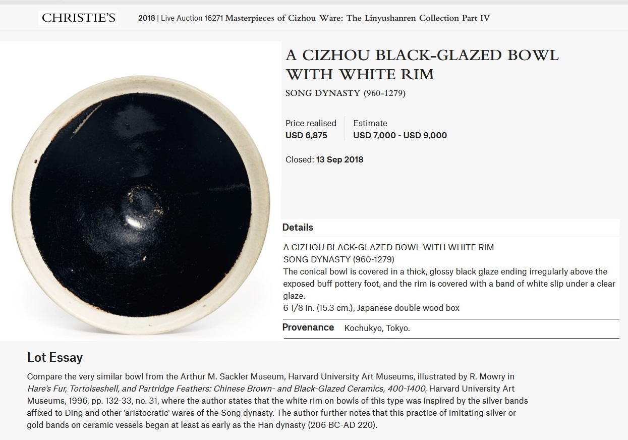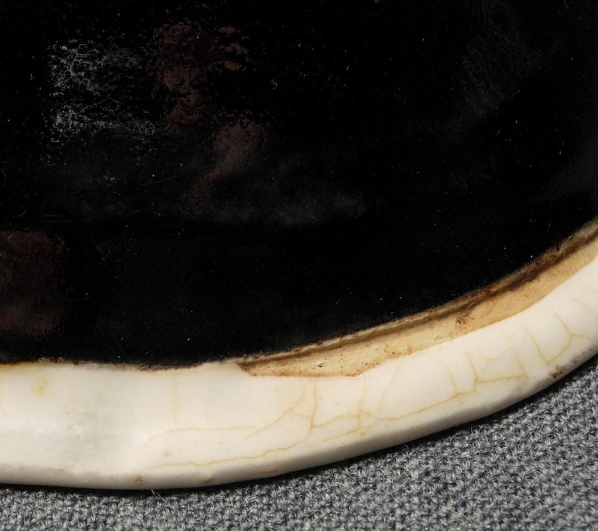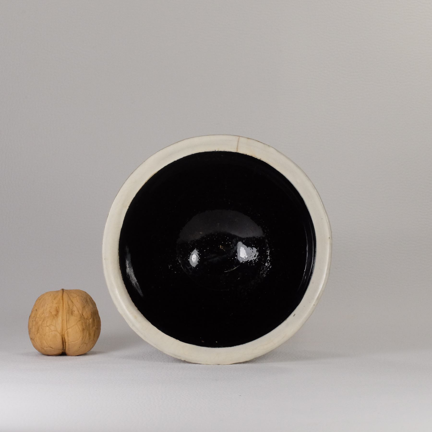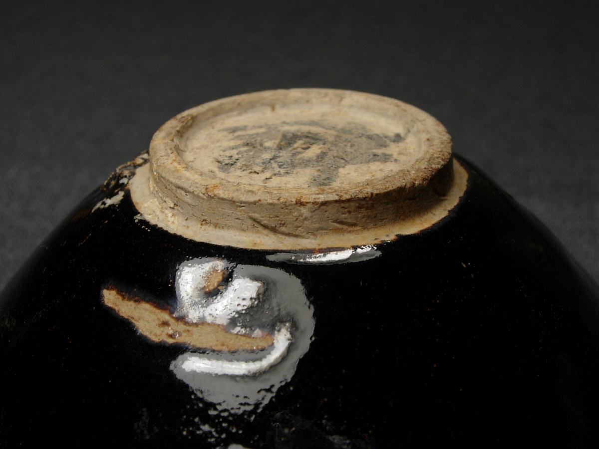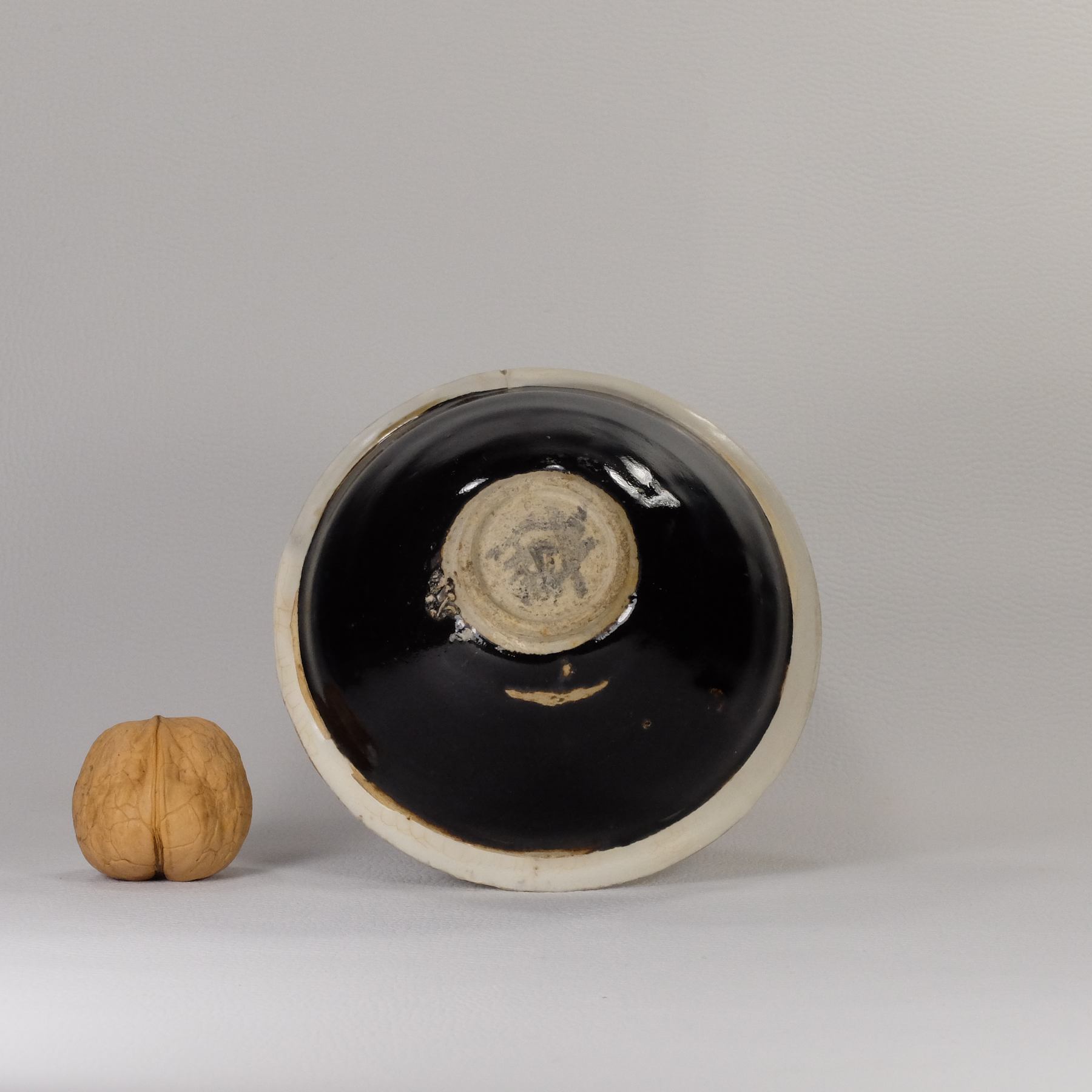 Notes: In our opinion, how these white-rimmed bowl was made is not clear. In the literature, it is usually said that the bowls were dipped in the black glaze, then the rim was wiped out, and then dipped in the white glaze. See for example “Hare’s Fur, Tortoiseshell, and Partridge Feathers” by Robert Mowry, at page 132, Bowl 31. That is not possible. It is true that at least the black glaze has been applied by dipping the bowl, as proved by the signs of potter’s nails that we can see around the foot in two pictures. But all the bowls of this type that we have handled, including our one as seen in his last picture, has a step at the matching borders of the two glazes, which means that the rim was scraped; then most probably after the first dipping the rim was scraped, not wiped off. At that point, the bowl has the black glaze and the bare rim. It is not possible that the rim has been glazed by dipping, because on all these bowls the white rim has the same width inside and outside the bowl. If dipped, the inner width should obviously be wider than the outer one, if the air inside the bowl was somehow not trapped. Instead, if the bowl is dipped vertically and the air is trapped, the rim will be narrower. Another possibility is that bowl was angled and rotated with a constant width dipping of the rim, but that would be almost impossible to do by hand. It must also be considered that there are some of these bowls where the white rim is only inside, which is totally excluding an application of the glaze by dipping. More probably, the white glaze was applied by brush, in which case the scraped step would help a lot in granting a glazes matching line uniform.