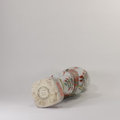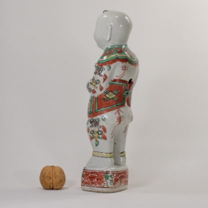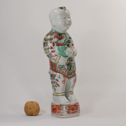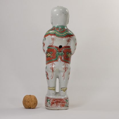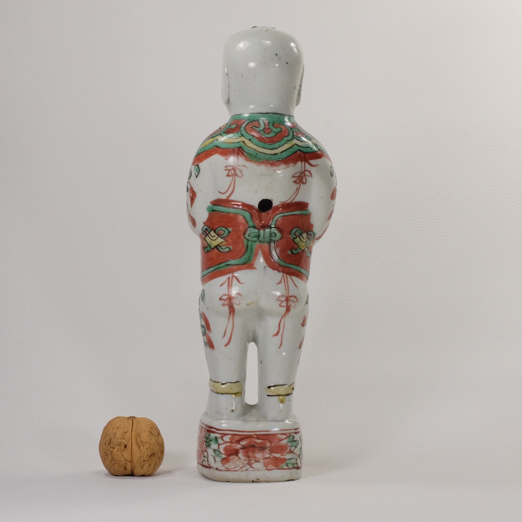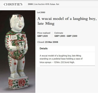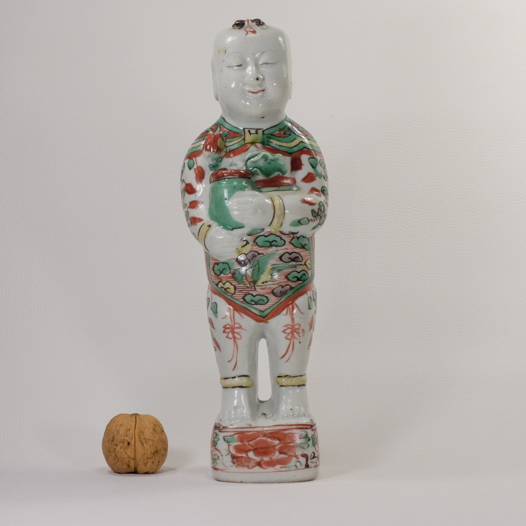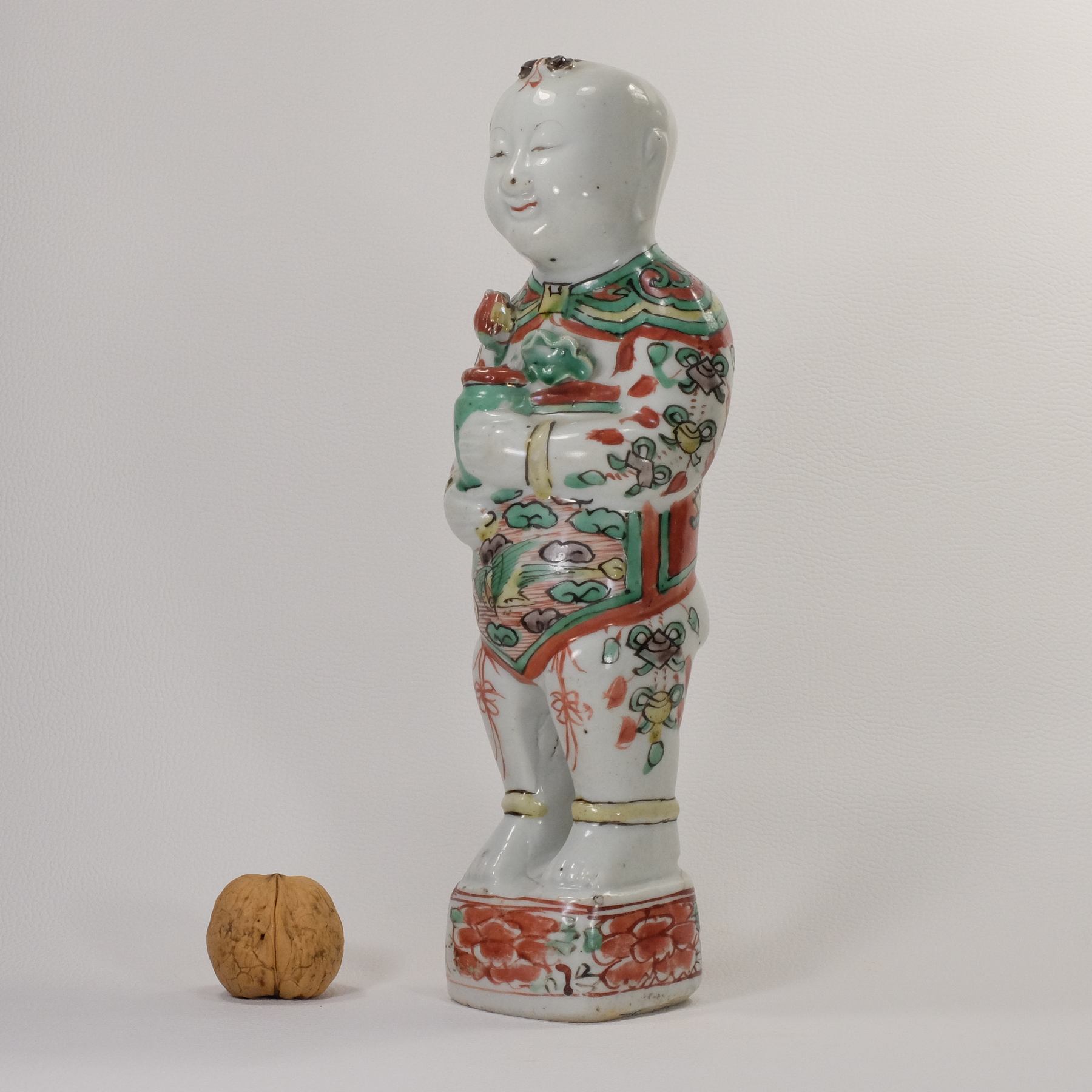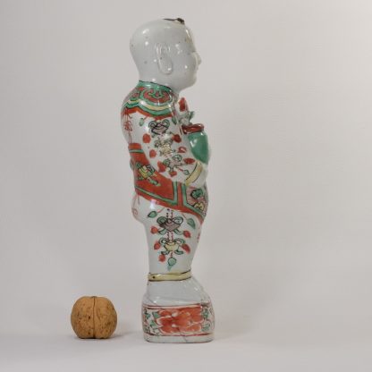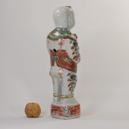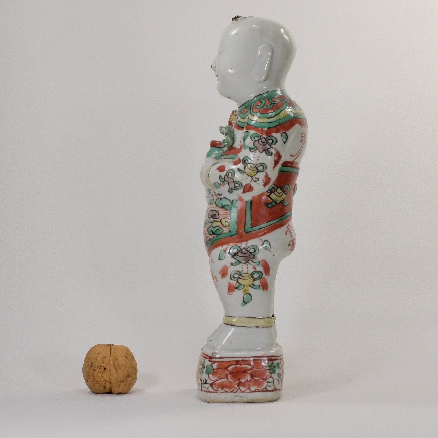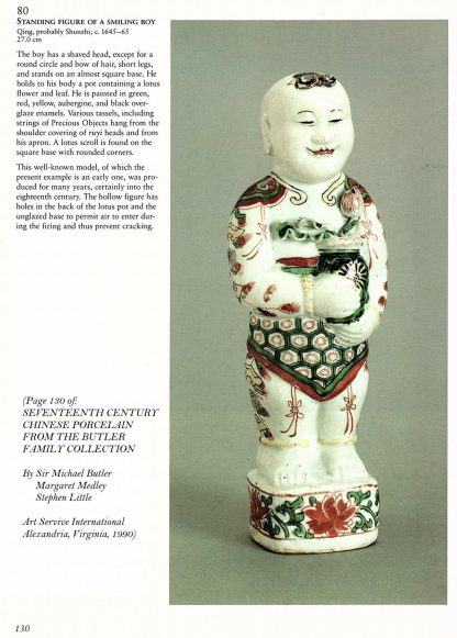 Description: Chinese Transitional/Qing dynasty statue of a smiling boy, decorated with over glaze enamels in the wucai palette. As said in the description of the reference figure from the Butler’s collection seen in the penultimate picture, these statues are known of having been made from 17th to early 18th century. Like the boy of that figure, our one too has a lingzhi shaped wrap covering his shoulders, with hanged precious objects, and is holding a pot with a lotus bud. It is worth to note that on this statue the wrap is secured by a Charm lock (see the Notes below).