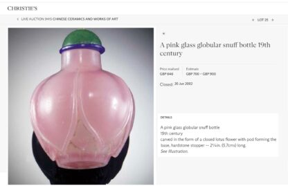 References: See in the last picture a bottle of the same shape, but with a simpler neck and made in pink glass instead of quartz and bigger than our one, sold by Christie’s on June 20, 2002.