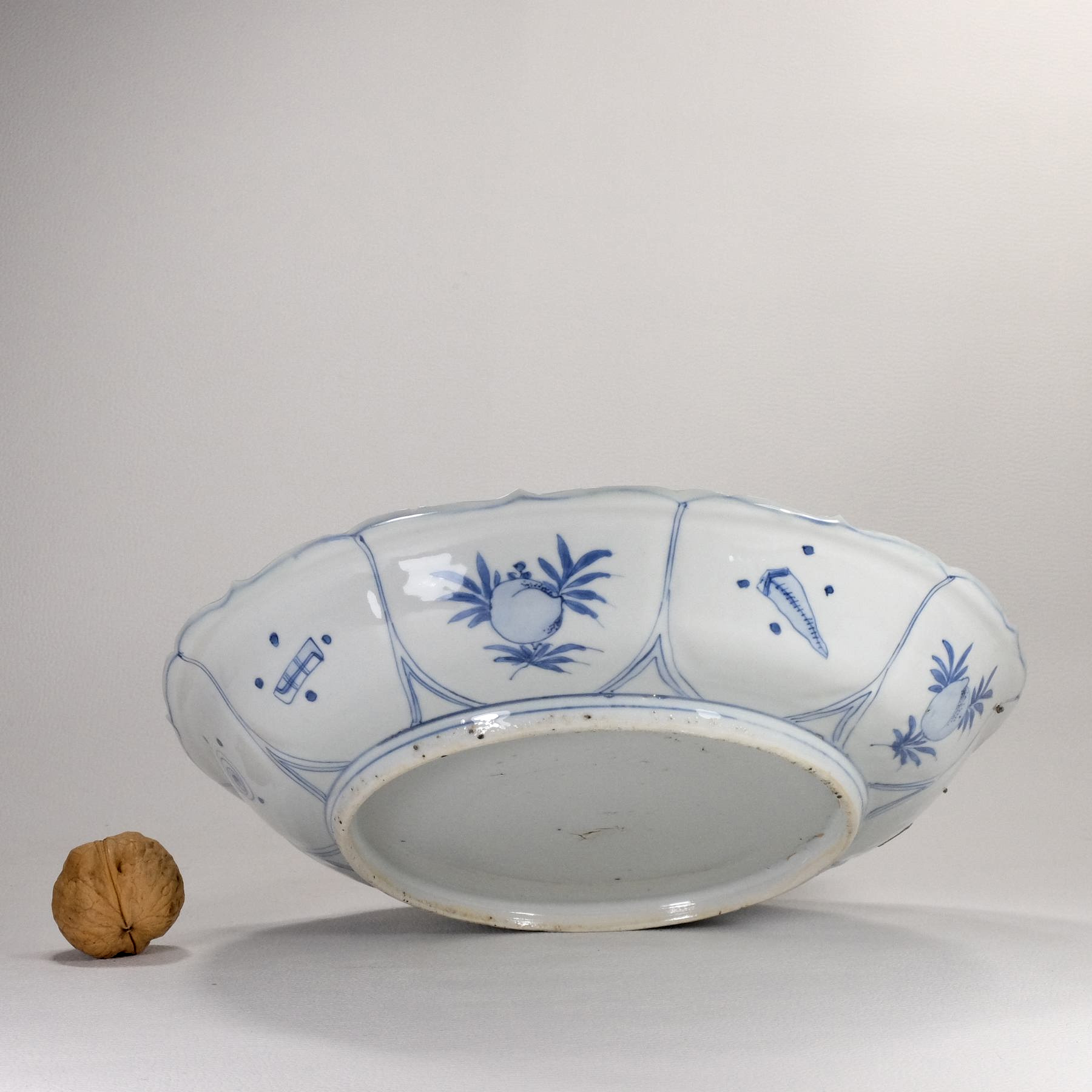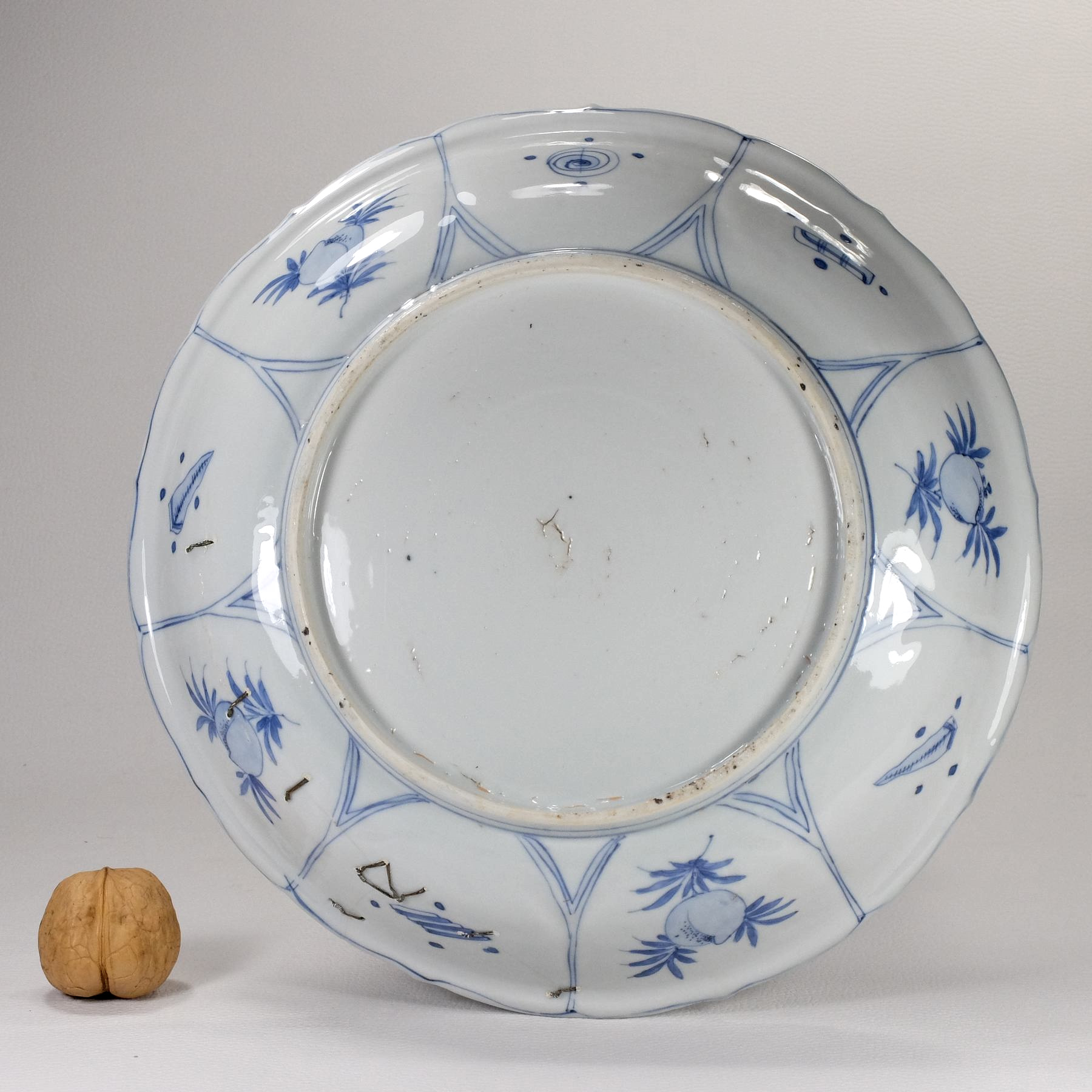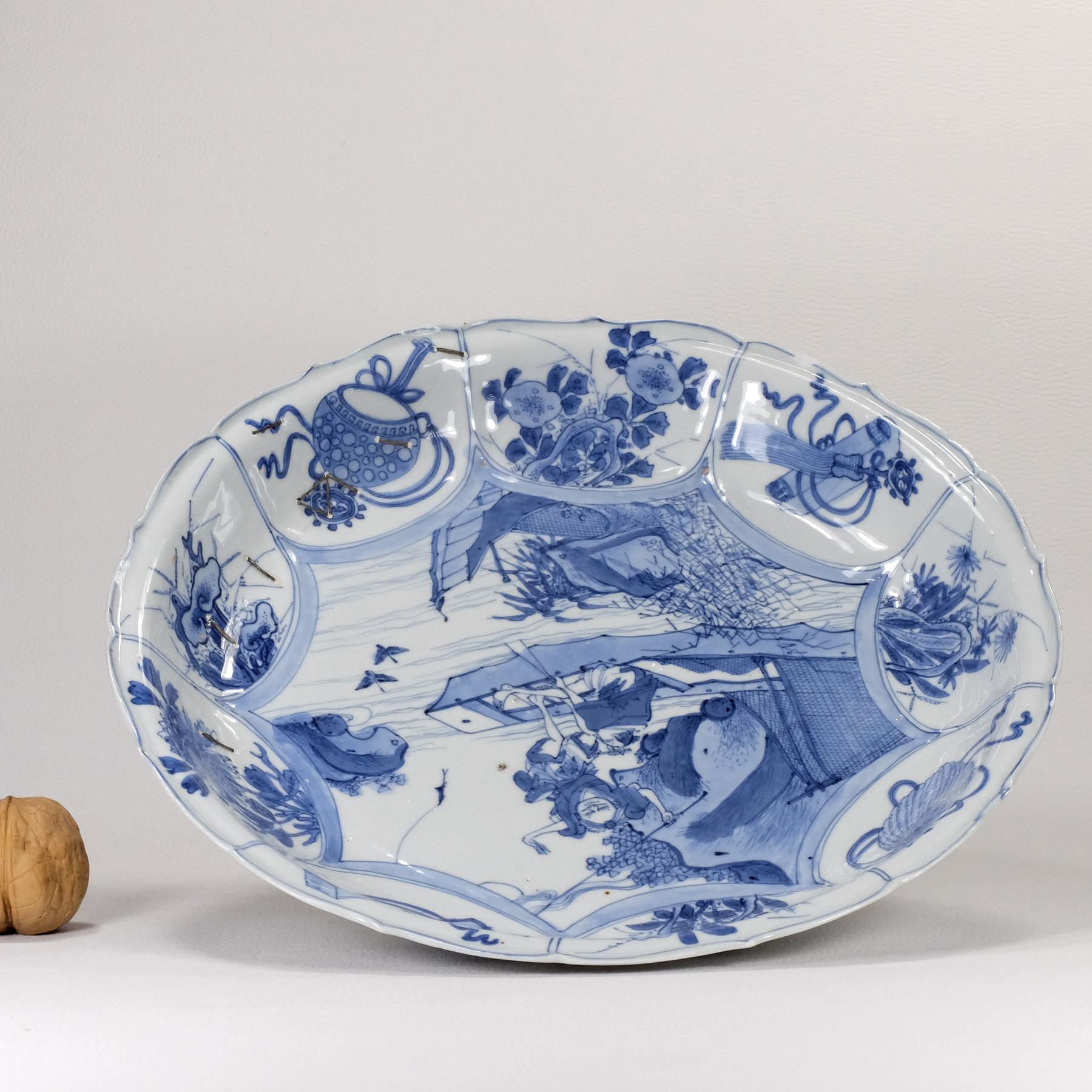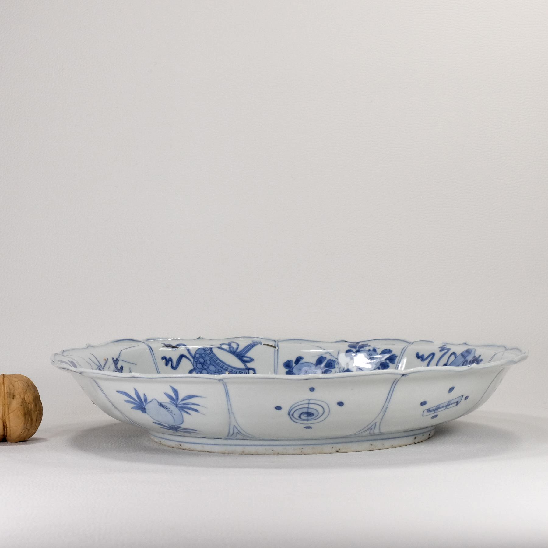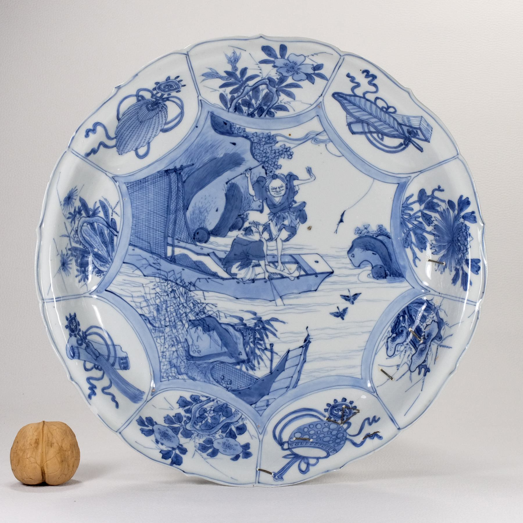 Description:   Chinese very rare porcelain kraak plate bearing an exceptional decoration of two fisherman on a boat. While one of them is rowing, the other is standing, showing excitement for the fish that has just taken the hook. What is remarkable on this plate is the three-dimensionality of the scene. In fact, the scene is seen from the shore in the foreground, where there are lake plants and a moored boat. The two ducks flying over the surface of the water towards the boat with the two fishermen are giving depth to the scene. A kraak plate with a fisherman who is about to remove a fish from his line, but standing on a river plank instead of a boat, is described by Teresa Canepa at pages 195-197 of “Jingdezhen to the World – The Lurie collection of Chinese export porcelain from the late Ming dynasty”. In the description, the Author say that the scene is extremely rare on kraak porcelain. Both plates must belong from the same kiln, judging by the pose and dress of the fisherman, but the painting quality of this dish is finer in our opinion.
