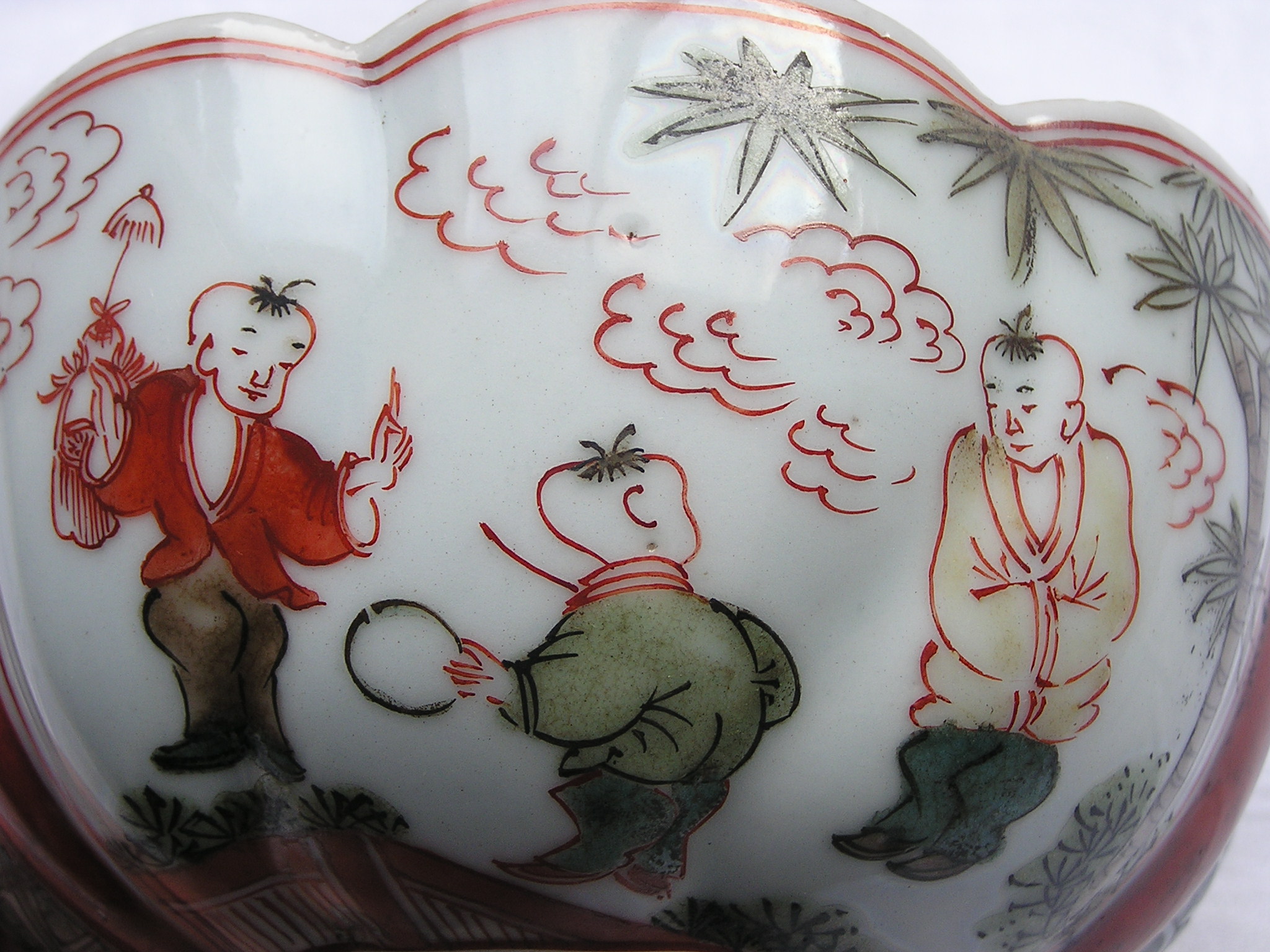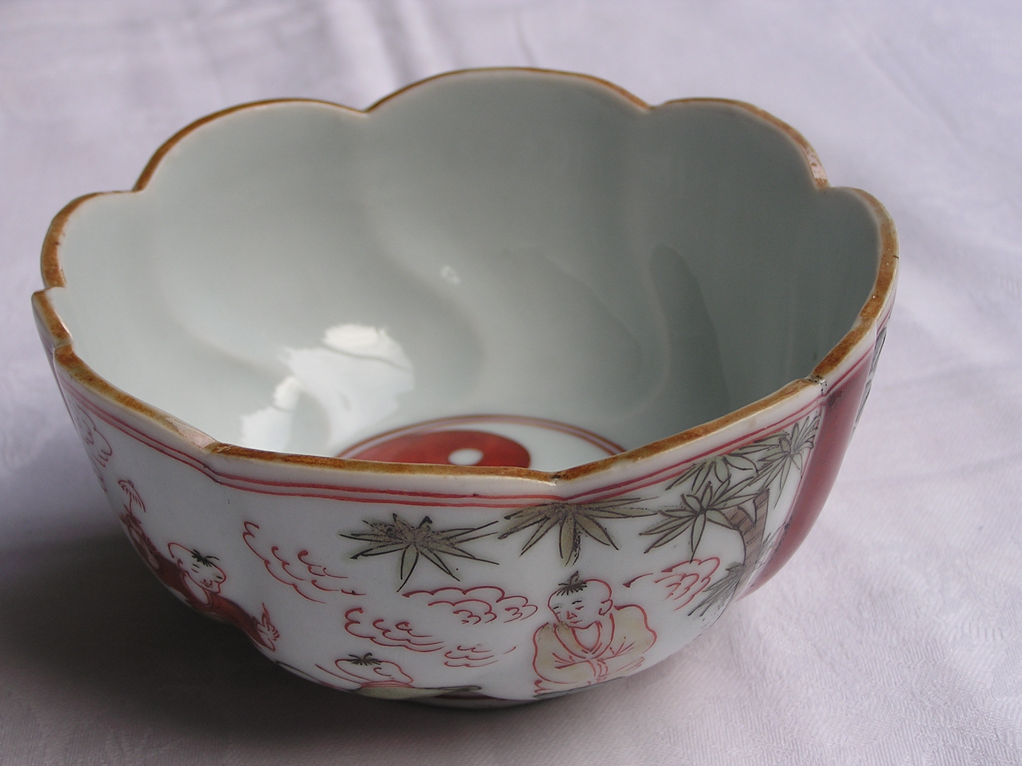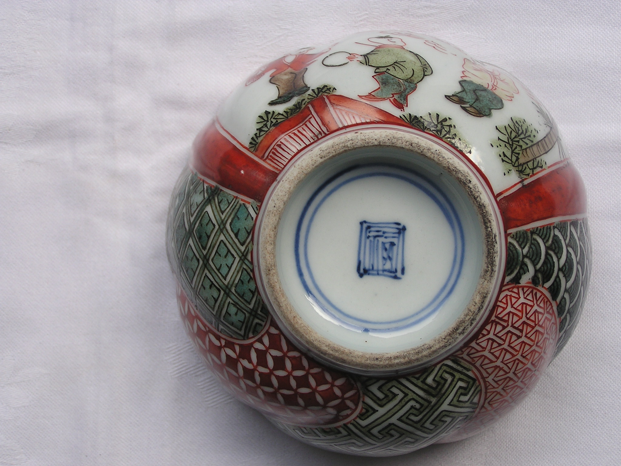 Imari bowl from the mid-Edo period. In the well, the yin/yang symbol, illustrating the concept of interdependence between opposing forces; On the outside, playing children and abstract patterns.